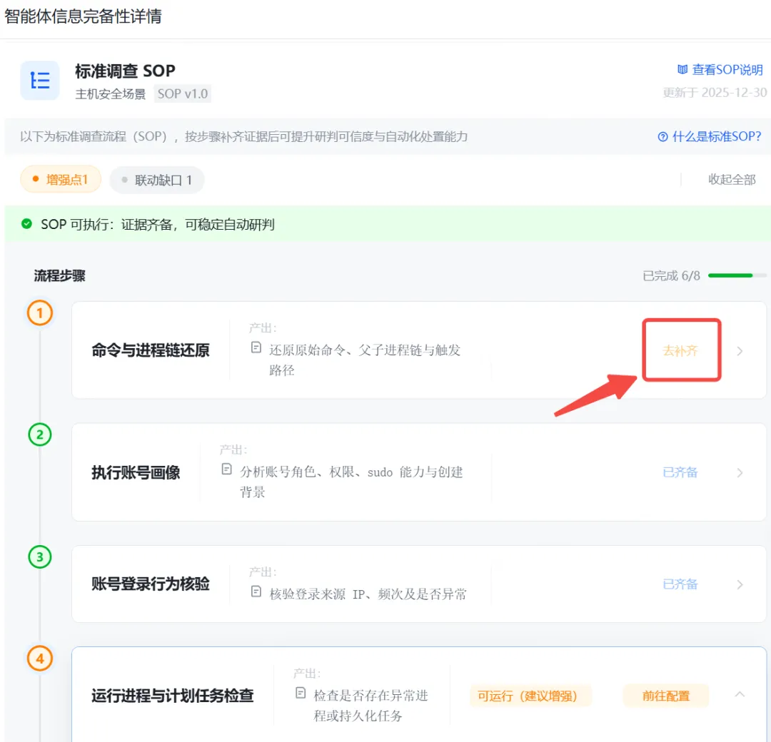 此时发现"命令与进程链还原”尚不具备,点击“去补齐”,会自动调用OpenClaw开始获取HIDS软件的进程链、命令信息。