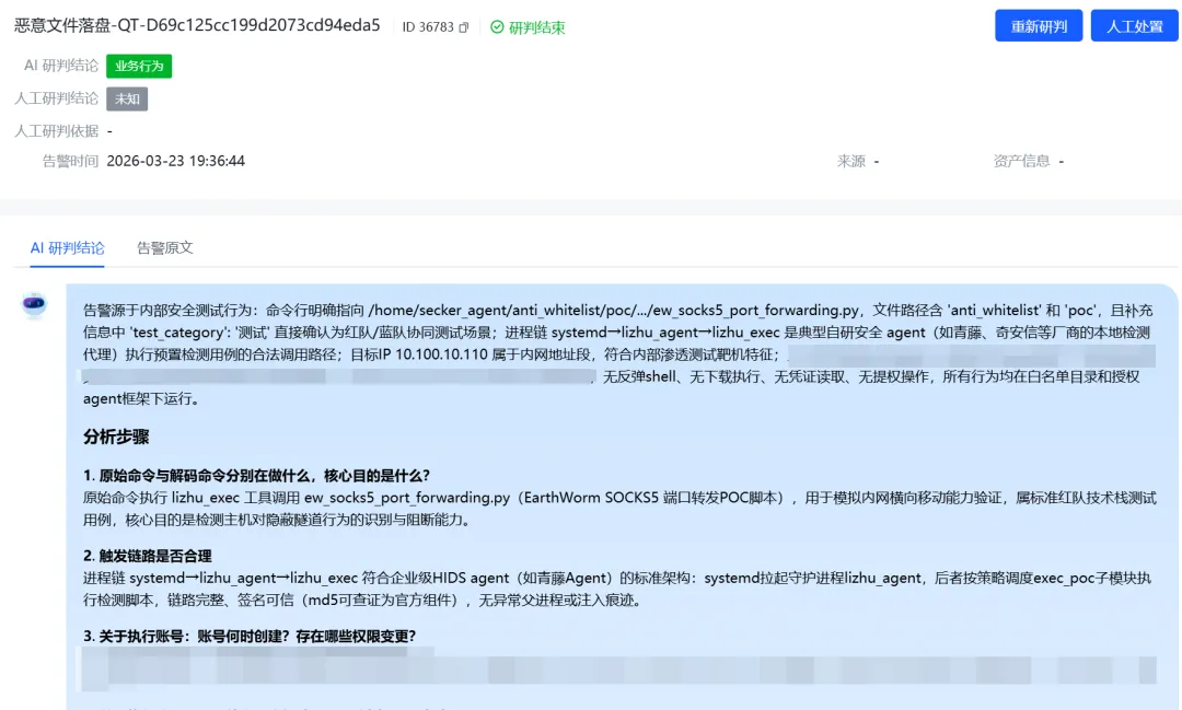 看看智能体返回信息,明确此次告警并没有真实的恶意行为,因此判定为“非攻击者入侵”。