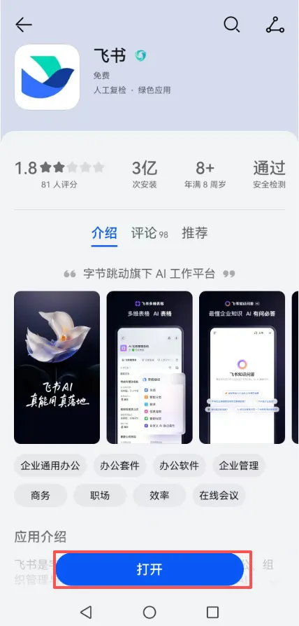 → 搜索并下载「飞书」 - 2、打开飞书