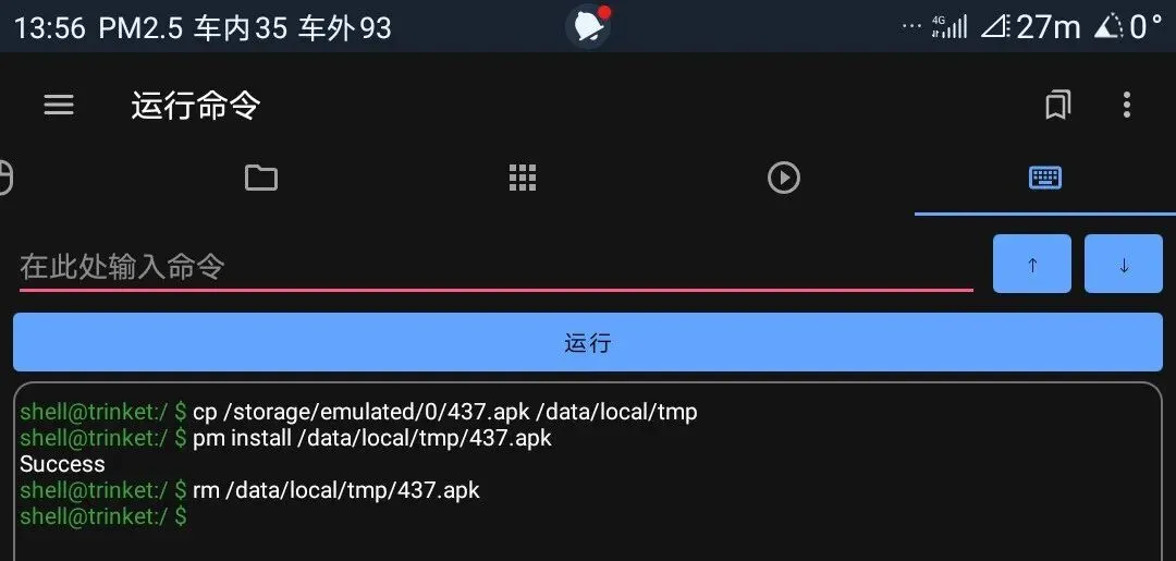 cp /storage/emulated/0/605.apk /data/local/tmppm install /data/local/tmp/605.apkrm /data/local/tmp/605.apk