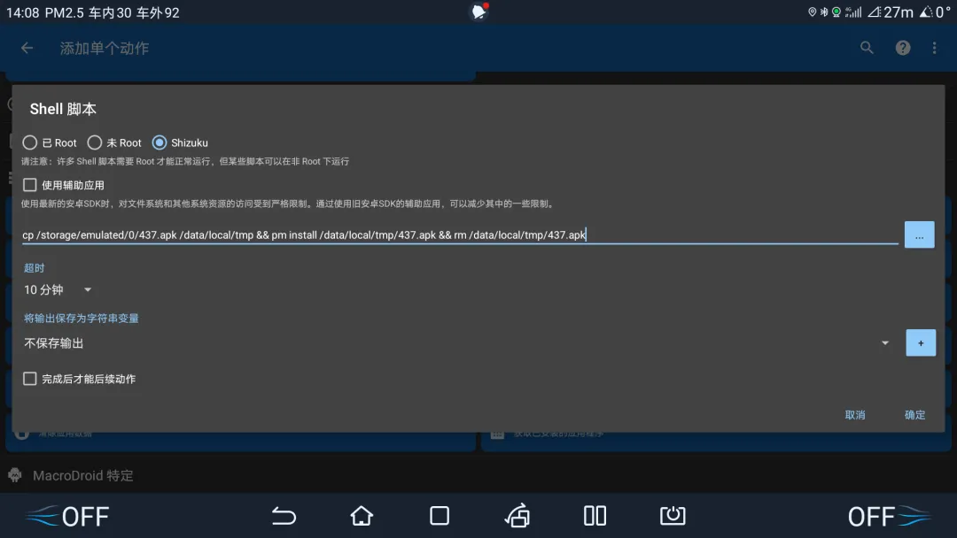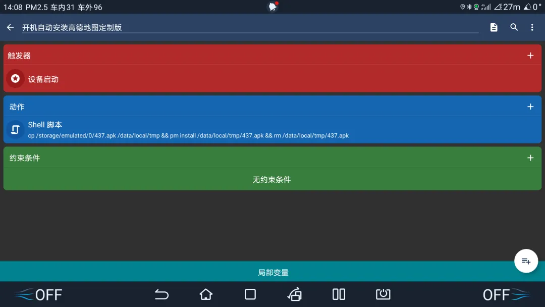 迪加执行SHELL[Y3AgL3N0b3JhZ2UvZW11bGF0ZWQvMC82MDUuYXBrICYmIC9kYXRhL2xvY2FsL3RtcCBwbSBpbnN0YWxsIC9kYXRhL2xvY2FsL3RtcC82MDUuYXBrICYmIHJtIC9kYXRhL2xvY2FsL3RtcC82MDUuYXBr]此外,你也可以继续优化命令,例如增加判断【高德地图定制版】是否消失再安装: