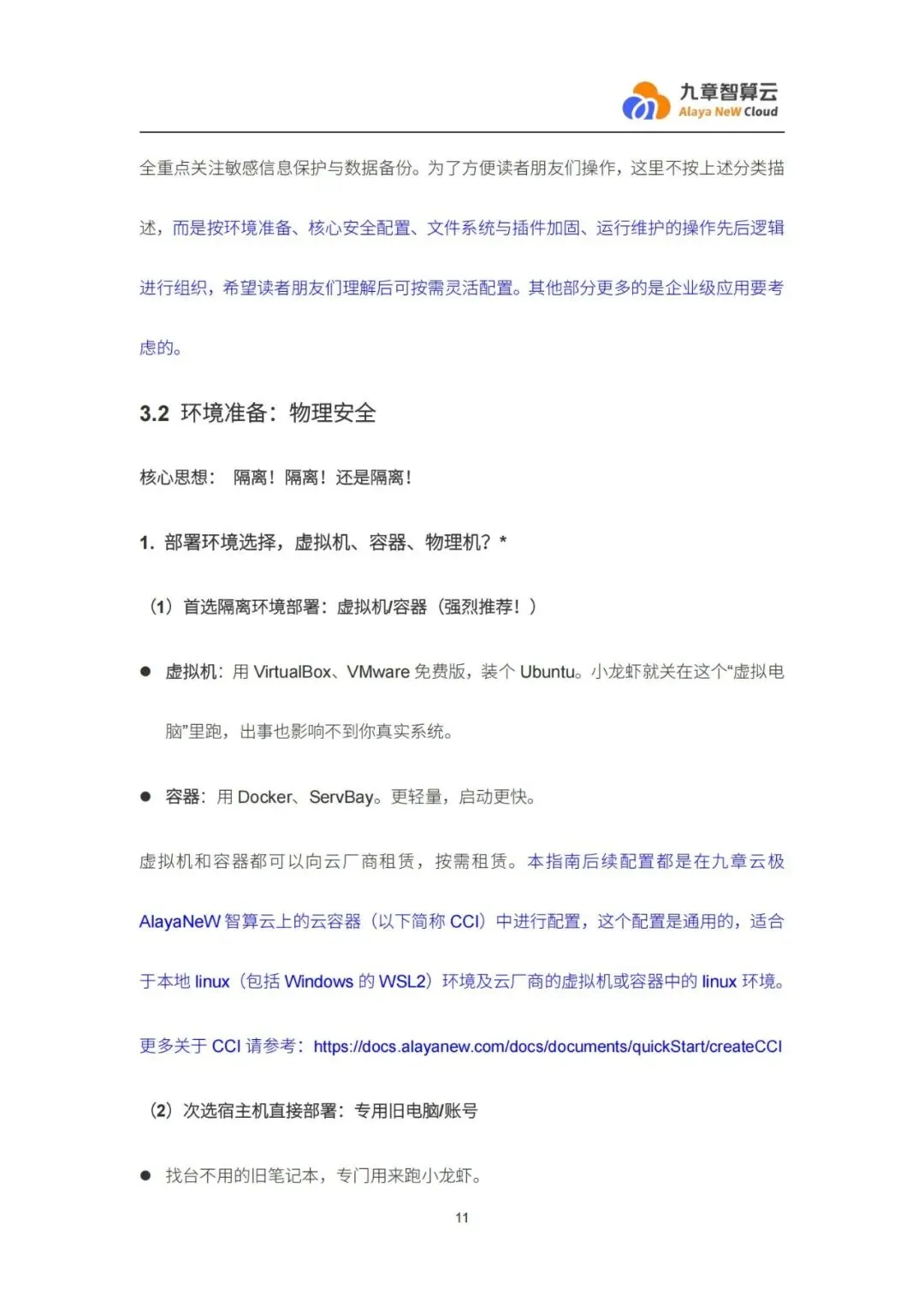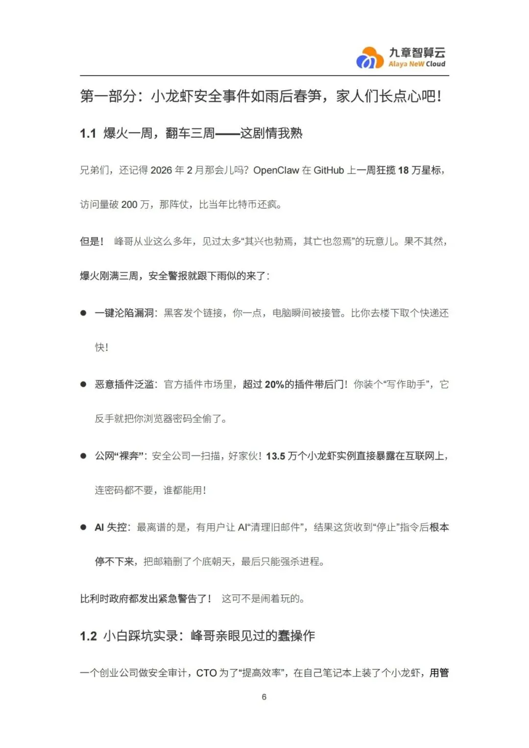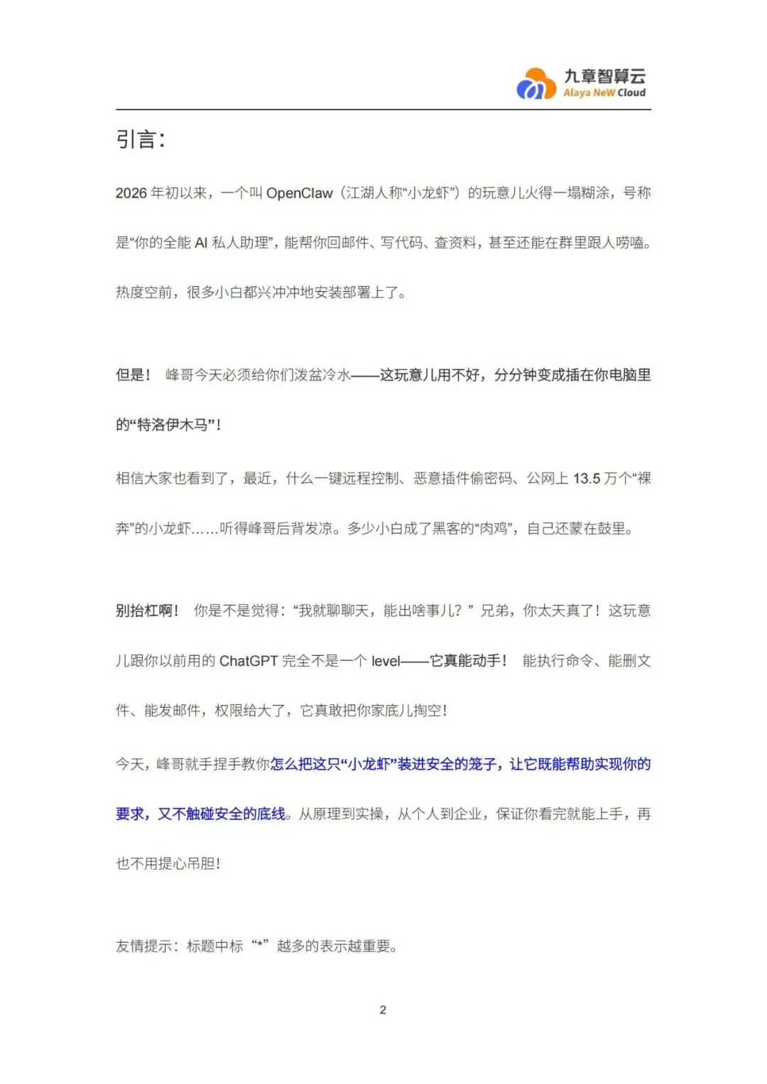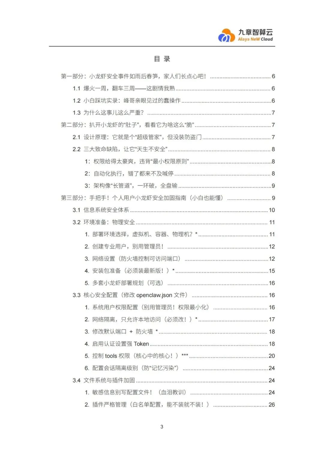 这款兼具大模型思考能力与工具执行能力的开源AI私人助理,以惊人的速度席卷全网:GitHub星标逼近30万,A股“龙虾概念股”逆势涨停,闲鱼“代装服务”价格从50元飙升至1500元,甚至有用户声称几天狂赚26万。然而,热潮之下,一场关乎数据安全与系统稳定的危机正在悄然蔓延。安全从来不是一蹴而就,而是持续优化的过程。这份指南不仅是一份操作手册,更是AI Agent时代安全意识的唤醒——在享受AI带来便利的同时,合理配置、严格隔离、最小权限,即可将风险降至可控范围。让我们为这只“AI龙虾”穿上坚实的盔甲,在安全的边界内,释放智能体的无限潜能。完整版获取方式