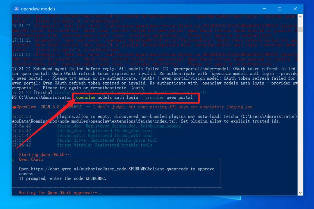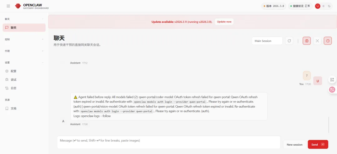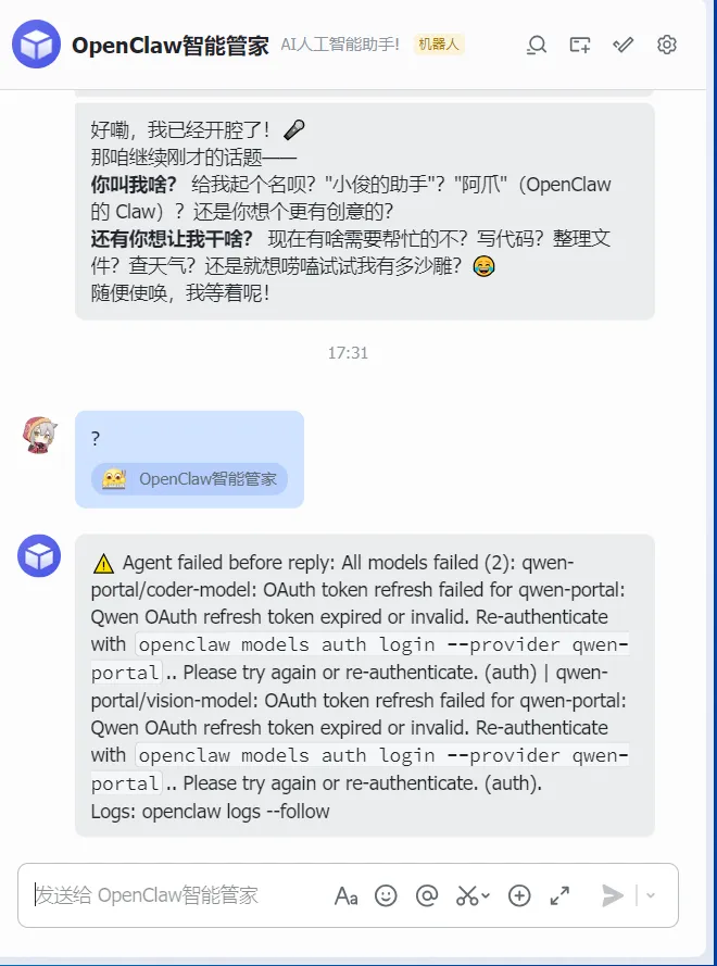 我用的是Qwen, 也就是通义千问免费版, 它这里是双重Token机制,短期Access Token几小时就过期,OpenClaw自动刷新失败, 所以重新认证登录就能恢复。✅
