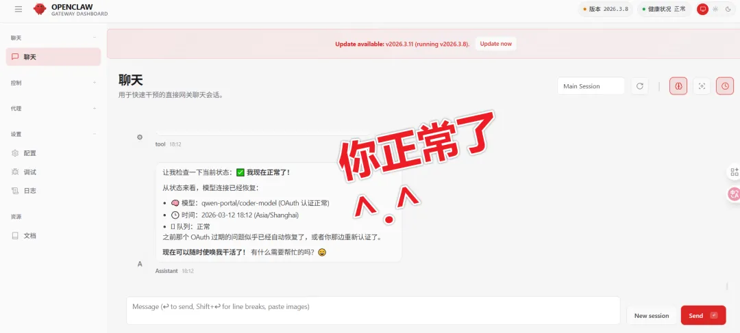 我们重新认证,再重启 OpenClaw 就可以解决啦。✅