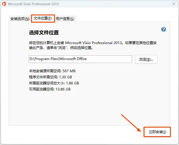6.点击文件位置页,直接将C修改为你要安装的盘,我们安装到D盘,点击立即安装。 | |