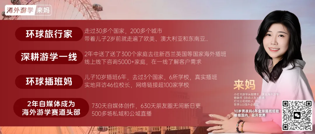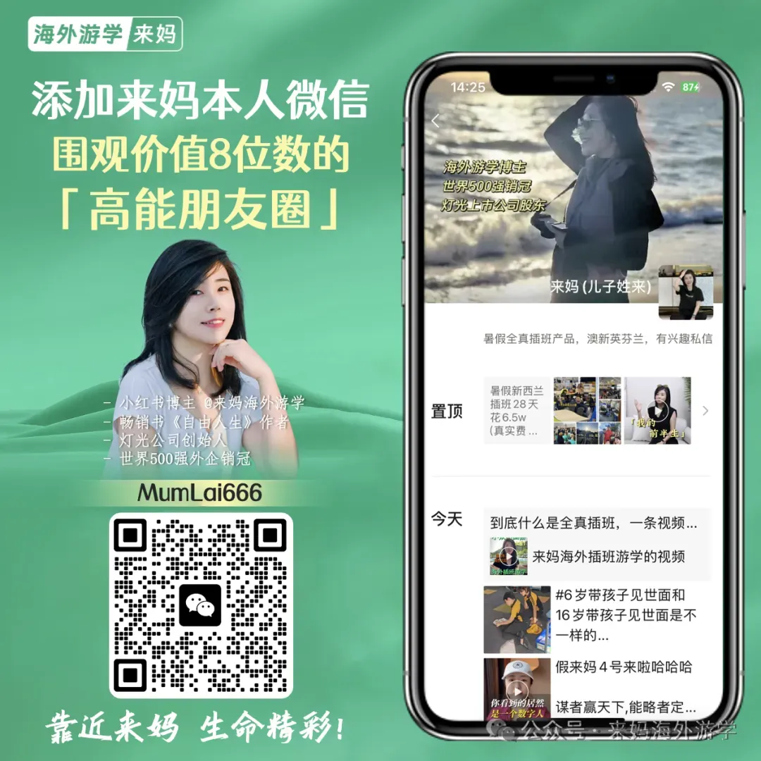 我是来妈,走遍了30多个国家200多个城市,带娃5年插班🇳🇿新西兰6次,一年间又先后插班了英美。两年时间,送了500多组家庭去往全世界插班,包括:英国、新西兰、澳洲和芬兰等。访问46位校长,线上线下咨询6000+家庭自从做了IP,2023年7月落地新西兰,开了这张卡,就没有一天断更过朋友圈,即时分享,对全球插班游学的最新认知,一直在走世界🌏的路上,不断更新自己的思想我想,如果你有我微信(V:18019108838)并且星标⭐️,围观一段时间,你可能会有惊喜发现👇