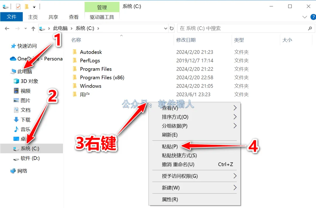 31.打开步骤17修改的磁盘(如:D盘,我在步骤18将C改为了D),鼠标右键空白处选择【粘贴】。