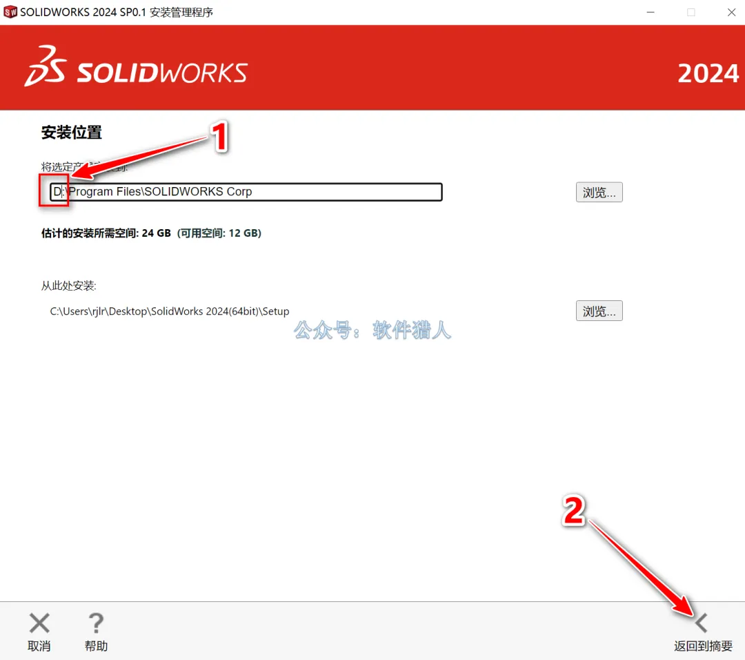 20.将安装路径地址中的第一个字符C更改为D(表示将软件安装到D盘),点击【返回摘要】。