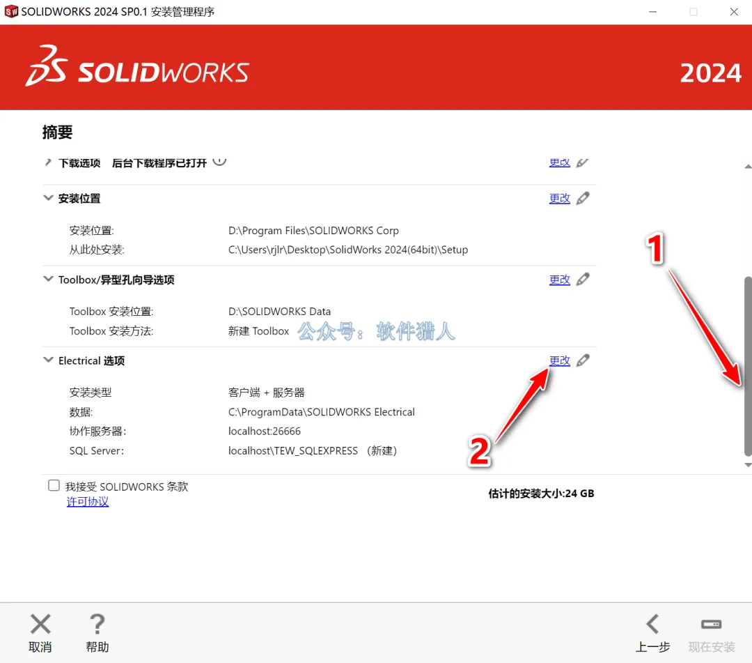 19.下滑页面,点击【Electrical选项】(若勾选了该产品才会有,没有勾选可忽略此步)后方的【更改】。