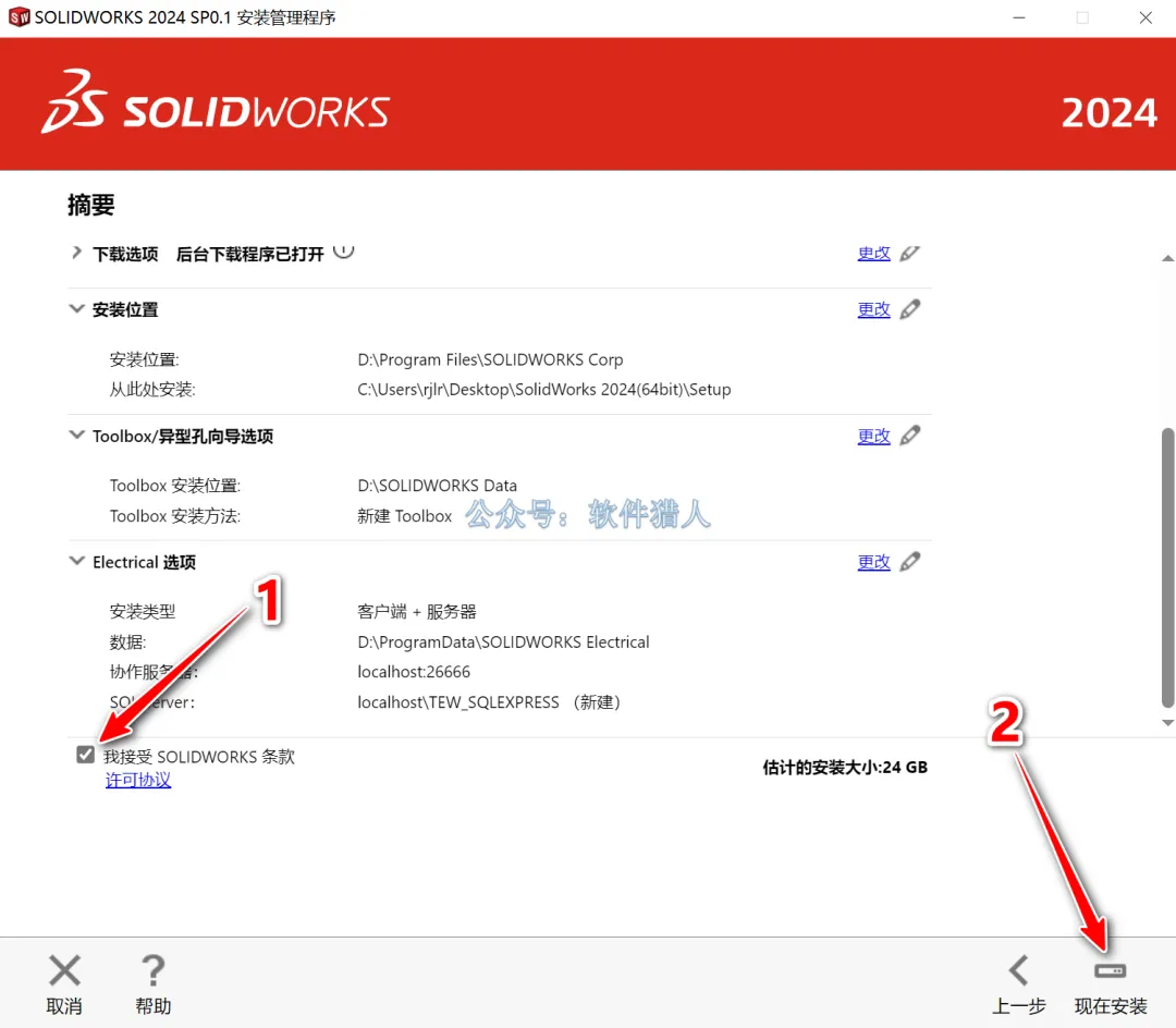 21.勾选【我接受 SOLIDWORKS 条款】,点击【现在安装】。
