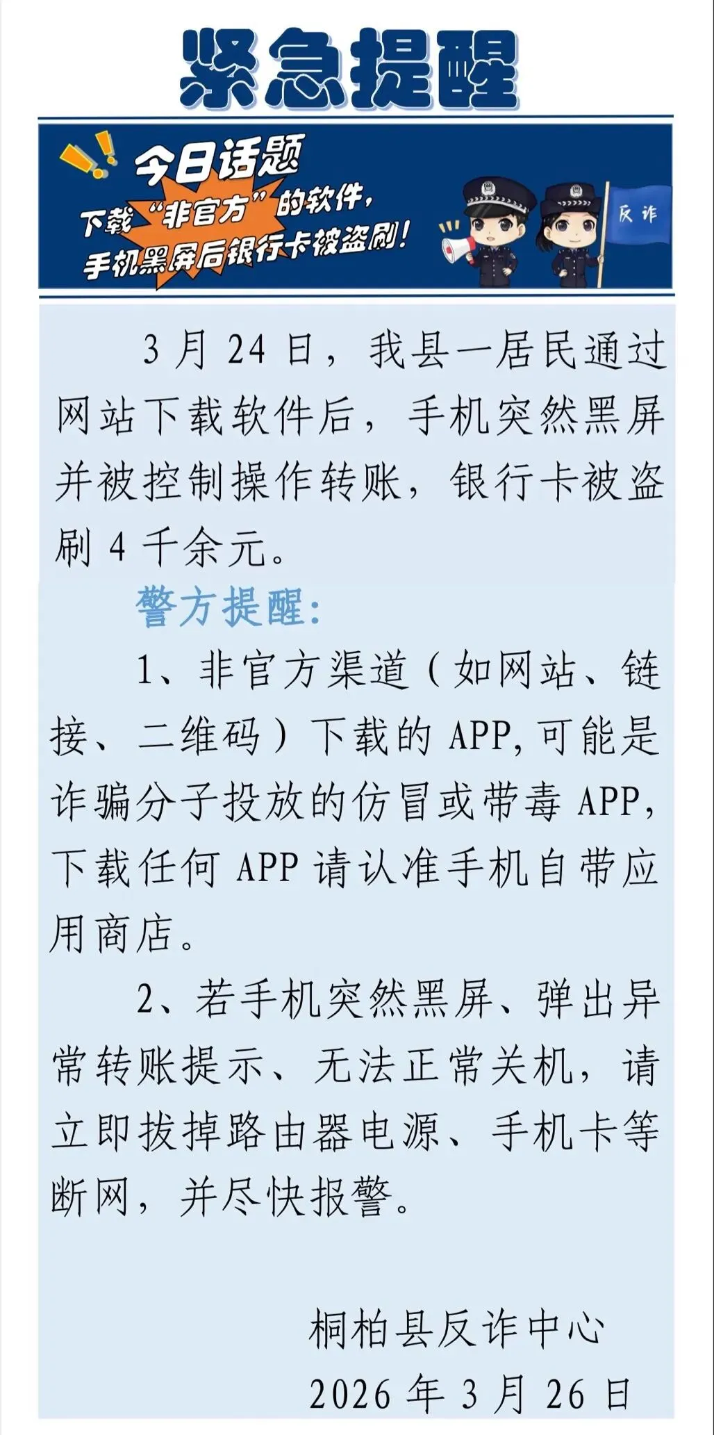 【反诈提醒】下载“非官方”的软件,手机黑屏后银行卡被盗刷!