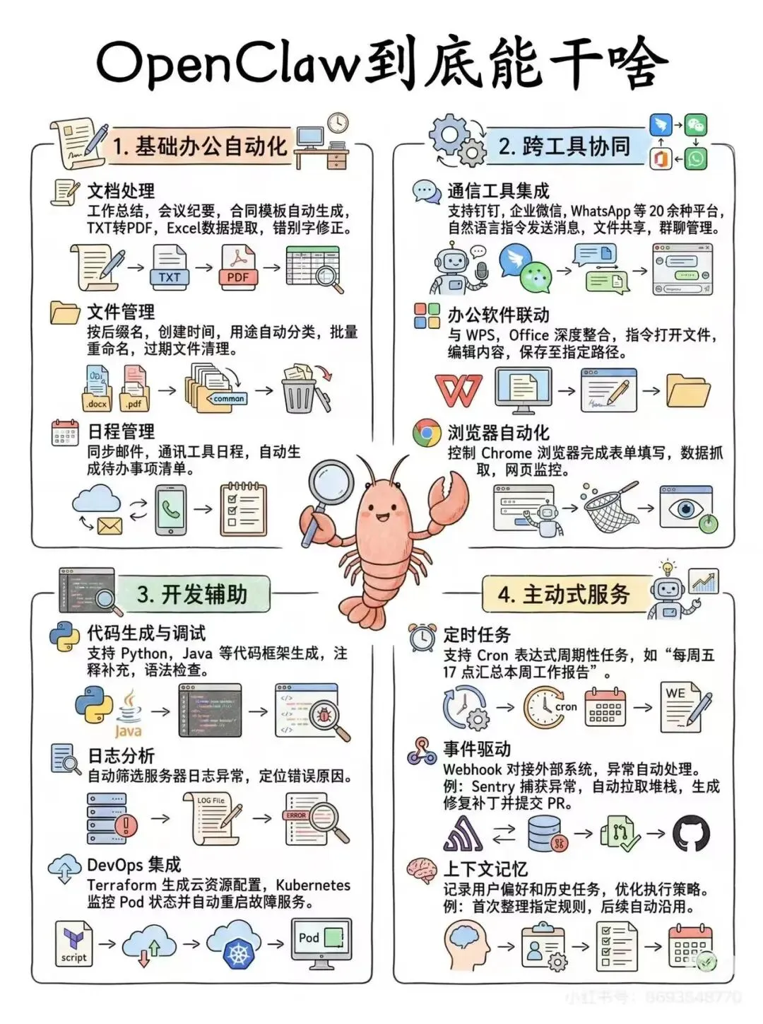 1.不同于传统AI仅能对话交互,OpenClaw 能从“动口”转向“动手”,覆盖多类场景: