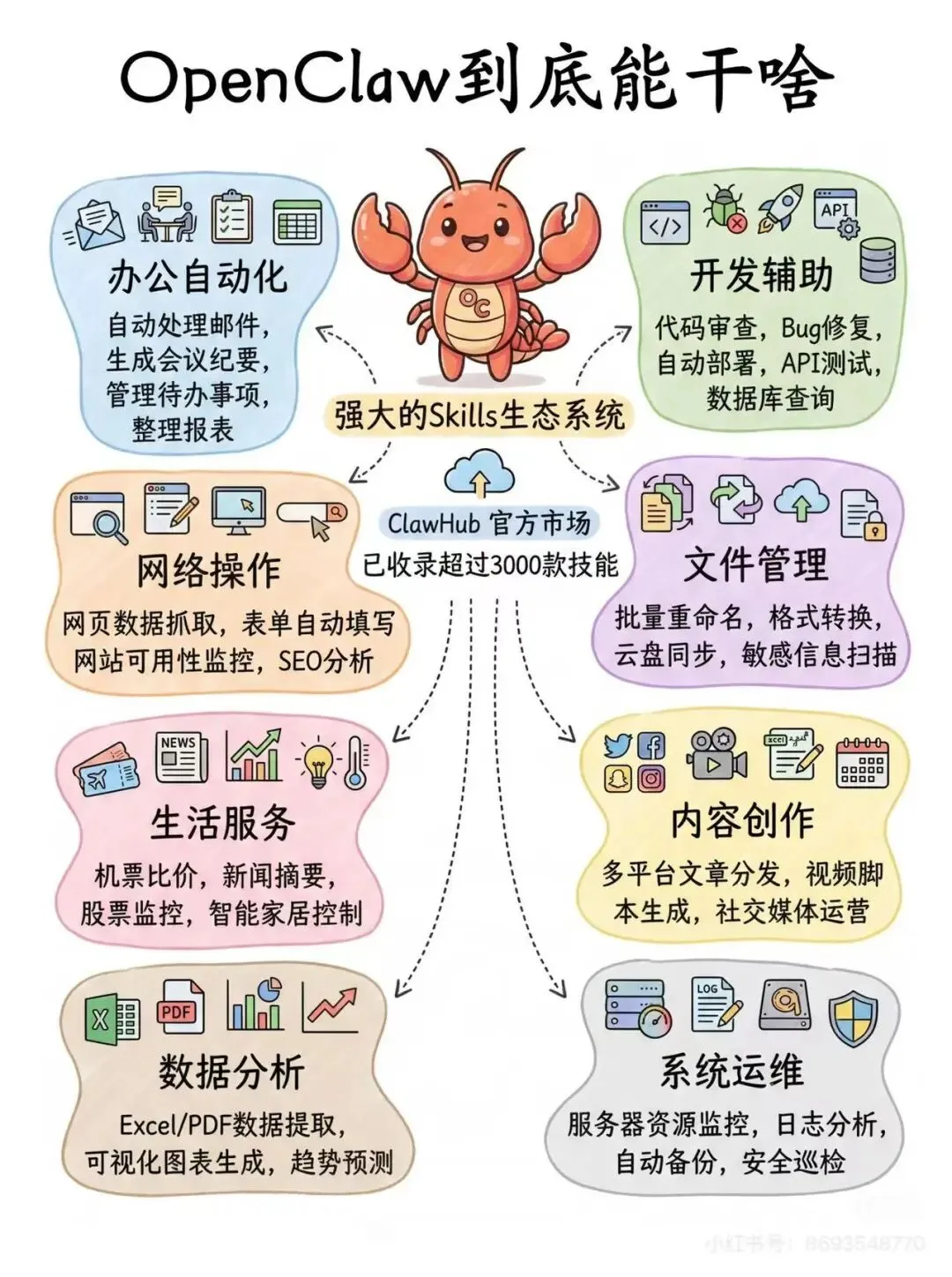 (5)其他场景(Skills生态系统)ClawHub官方市场已收录超3000款技能,覆盖: