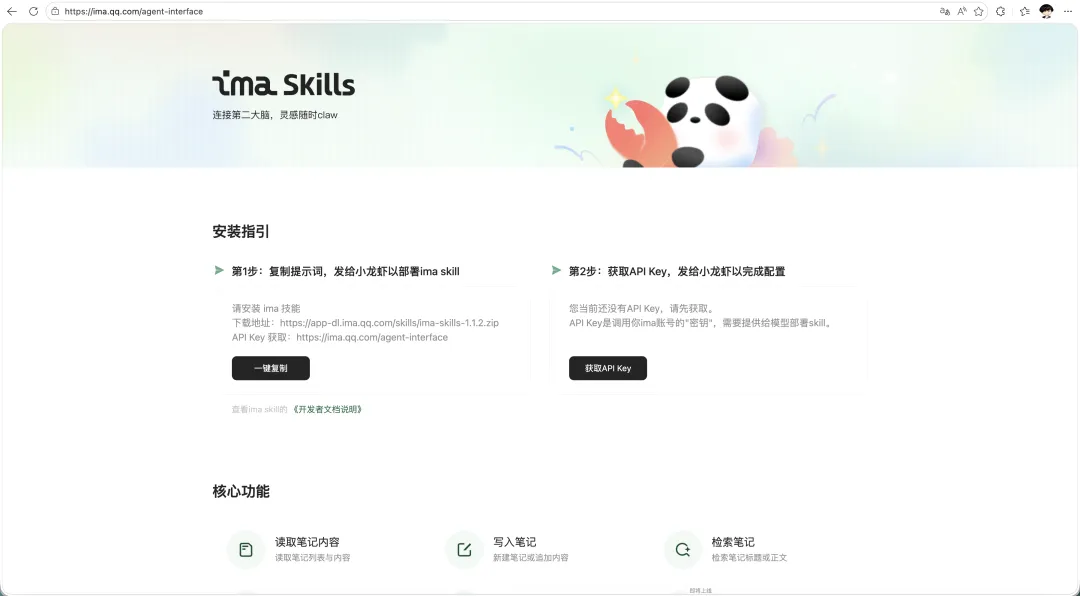 通过这个技能,小龙虾可以直接读写你的 ima 笔记和知识库。我已经放弃了OneNote,目前笔记都迁移到腾讯ima了,有AI搜索加上小龙虾还是很香的。Step 1:获取“钥匙”打开ima 客户端,点击头像 ->【Claw 配置】。点击【获取 API Key】,复制生成的密钥(弹窗只出现一次,务必保存)。或者访问https://ima.qq.com/agent-interfaceStep 2:投喂给小龙虾在 ima 的【Claw 配置】页面点击“一键复制提示词”。将提示词和 API Key 依次发送给小龙虾,直到它回复“IMA 技能安装完成”。