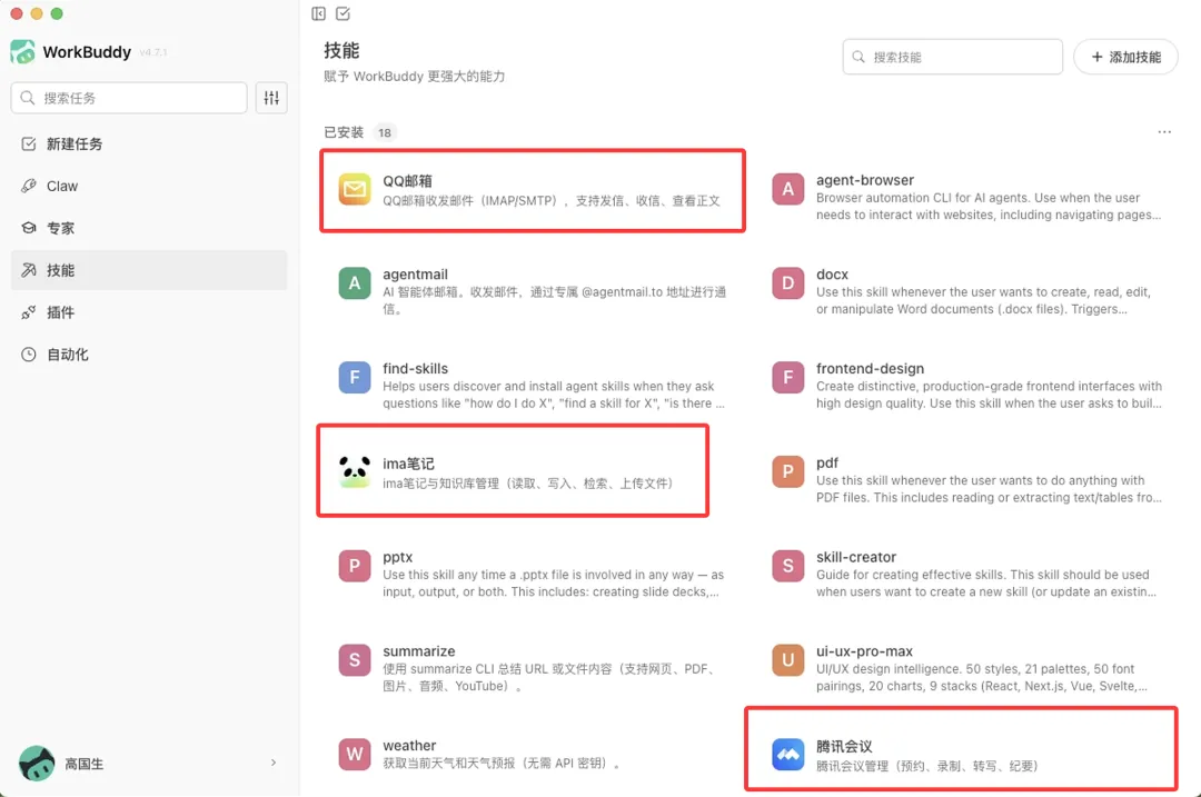 如果你还在手动打开 ima 复制笔记、登录网页版邮箱查邮件、在腾讯会议里手动拉会,那你可能已经 out 了!最近OpenClaw升级了3.22、3.23、3.24版本后罢工了,现在基本上转向腾讯的QClaw(微信远程操控版)和WorkBuddy(企业办公版)两款“小龙虾”产品。之前的文章已经介绍过了龙虾兄弟,在此就不再赘述。现在每天基本上就指挥这两只龙虾兄弟干活,一个办私事,一个办公事。今天,我们就来实战演示:如何通过安装“技能”,让小龙虾打通腾讯系产品,实现 ima 知识库自动读写、腾讯会议一句话管理、邮件智能处理。