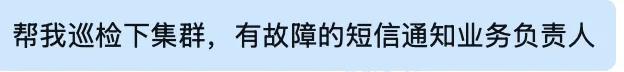 一句大白话:“帮我巡检下集群,有故障的短信通知业务负责人。”