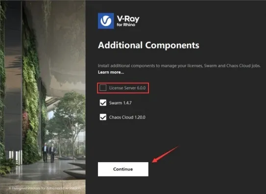 5.取消勾选【License Server 6.0.0】,点击Continue。