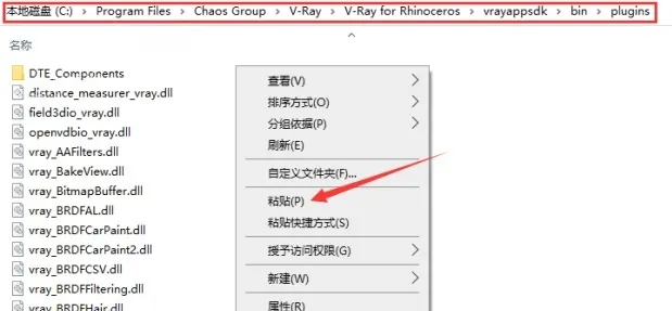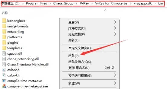 14.打开图示路径【C:\Program Files\Chaos Group\V-Ray\V-Ray for Rhinoceros\vrayappsdk\bin】,在空白处右键粘贴。