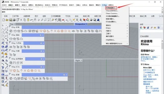 21.点击V-Ray菜单选择【资源编辑器】可以设置渲染器参数。