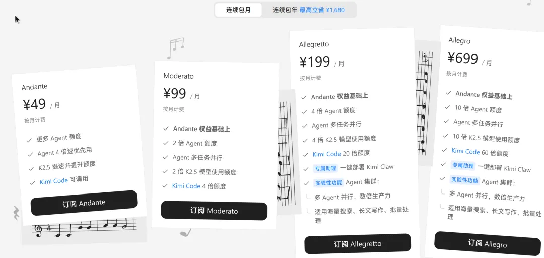 Kimi 49 元/月,使用限额个人感受很少,可能跟claude的账户差不多,主要用于openclaw和claude code的话,从性价比上感觉不如GLM。
