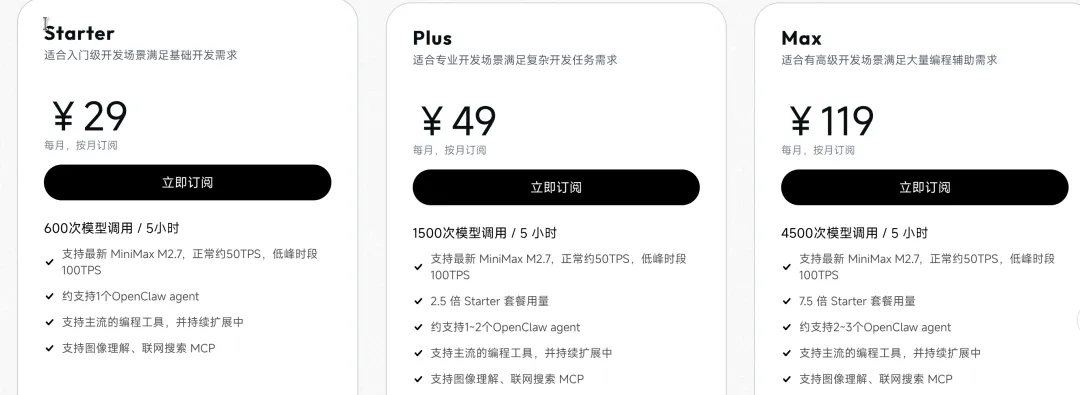 3. Minimax Token Plan:基础版不知道有几倍claude pro用量,但是之前用起来几乎没有碰到过5小时限额,目测是最便宜大碗的一个订阅。