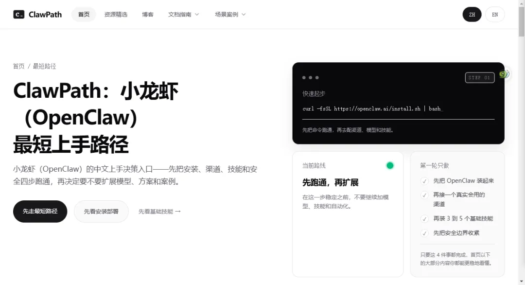 ClawPath https://clawpath.dev/ ClawPath是一个专注于 OpenClaw(小龙虾)AI 助手的中文最短上手路径指南网站。它的核心目标是帮助新用户用最短时间、最稳步骤跑通基础链路,再决定是否深入扩展。