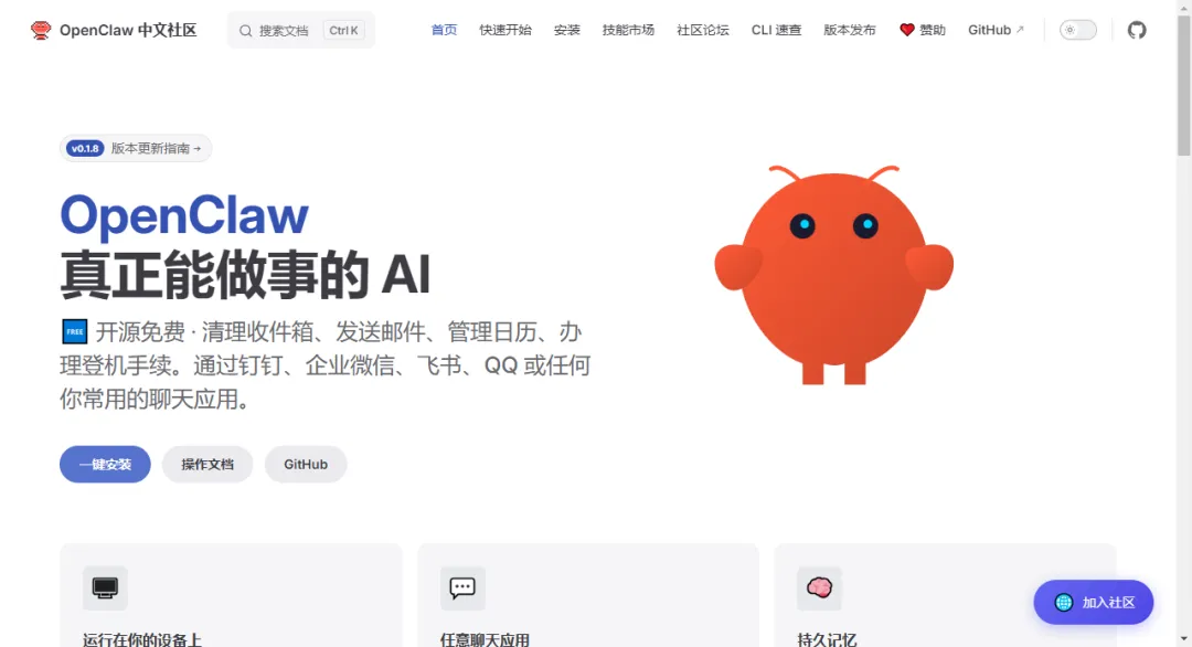 OpenClaw中文社区 https://clawd.org.cn/ OpenClaw 的中文社区分支官网,致力于为中文用户提供开源免费的 AI 助理平台,并保持与上游官方版本的同步更新。