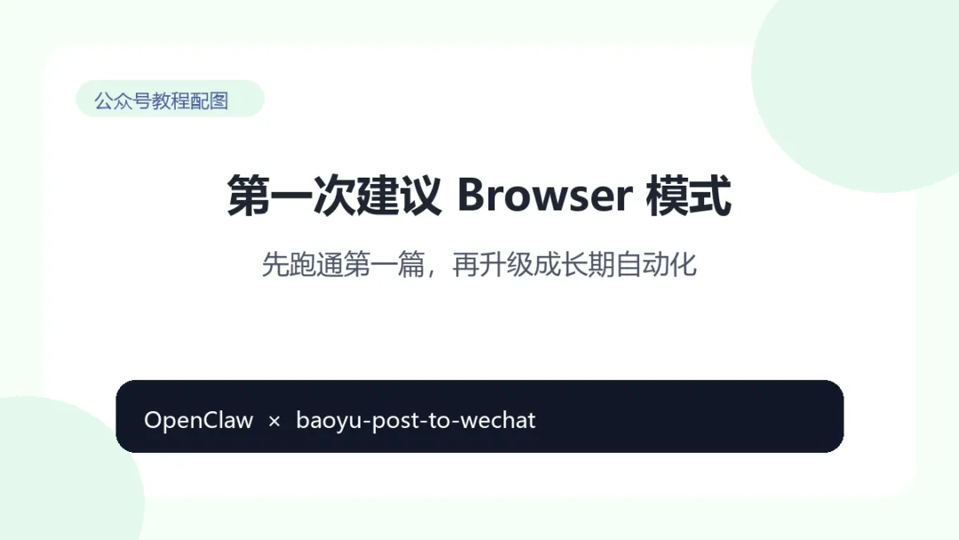 如果你是第一次接这套,我建议先用 browser 模式 跑通第一篇。原因很简单: 先验证流程能成,再谈进一步自动化。