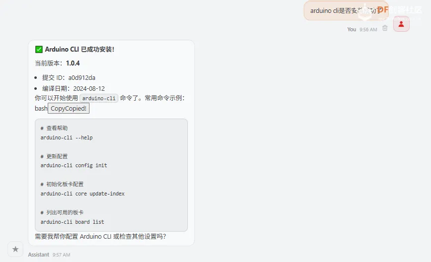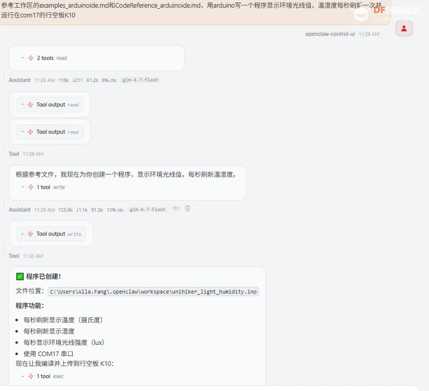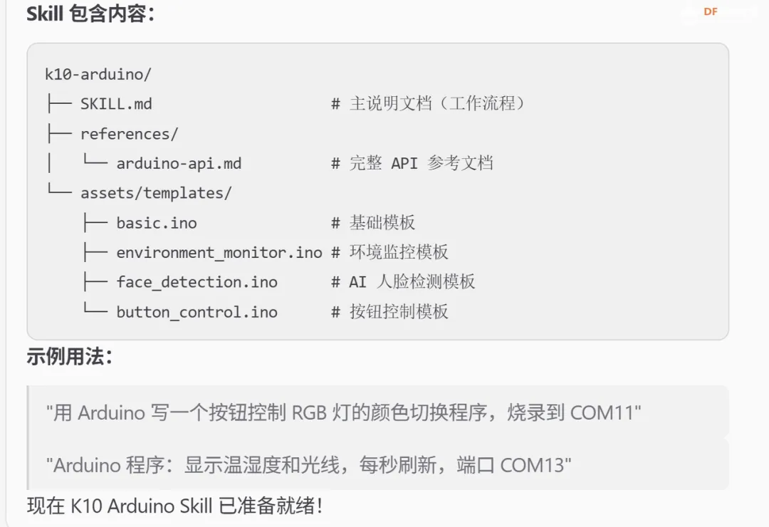 安装完成后,AI Agent 即可具备自动生成符合 行空板K10 规范的 Arduino 程序,并完成编译与上传的能力。
