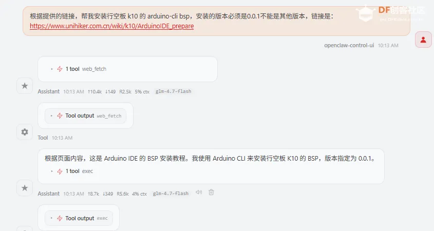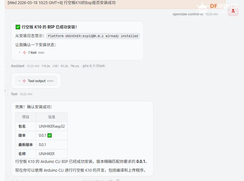在完成 Arduino CLI 安装后,下一步需要让 OpenClaw 安装行空板K10 的 BSP(板卡支持包),这里指定安装行空板K10的bsp版本为0.0.1。