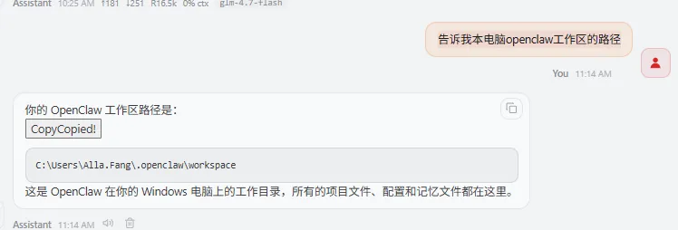 你可以输入指令询问OpenClaw工作区的具体路径: