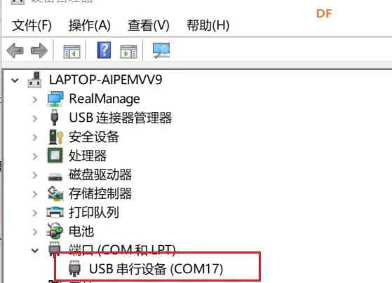 使用USB数据线连接行空板K10与电脑,打开设备管理器查找行空板K10对应的端口号。