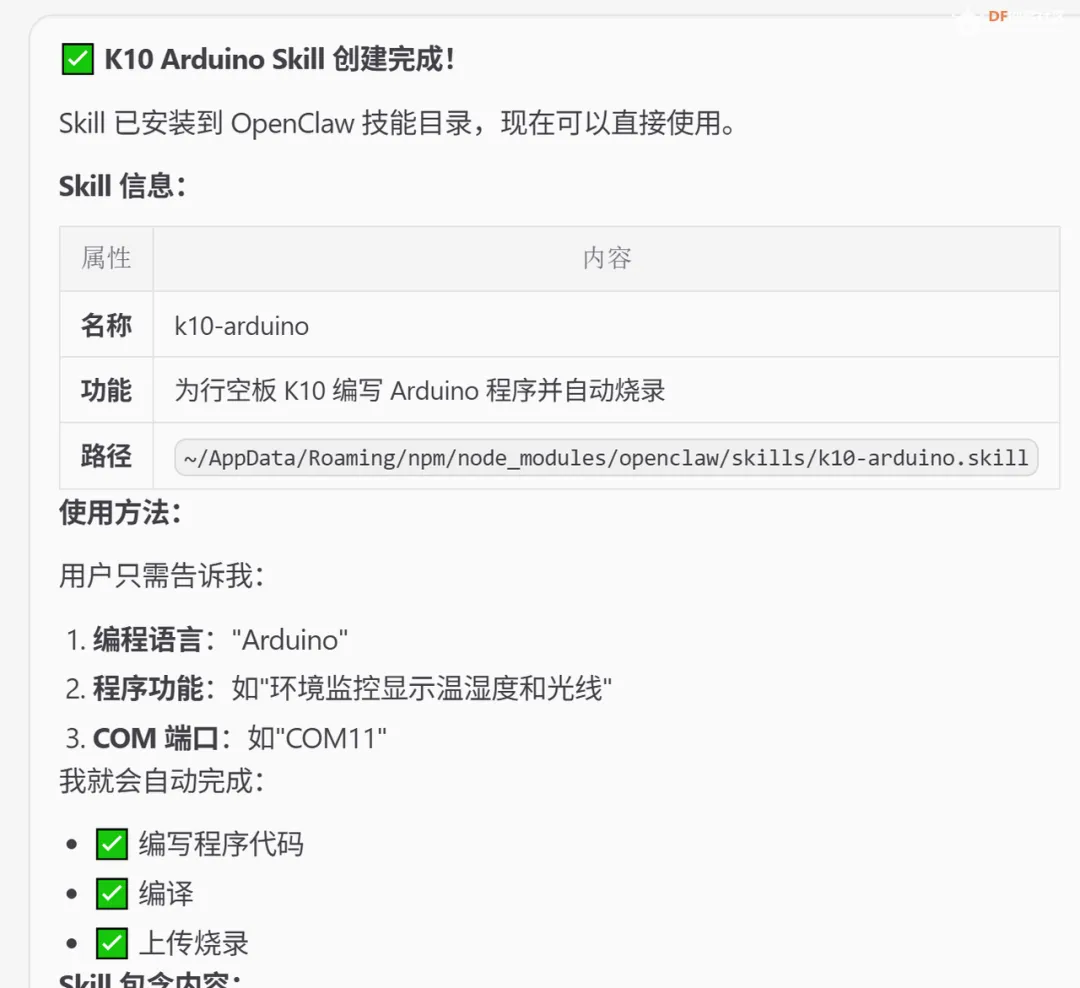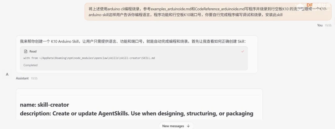 我们可以将上述使用Arduino CLI写程序并编译上传的过程写成一个skill安装在自己电脑的OpenClaw中,这样在让OpenClaw通过自然语言控制行空板K10时就不用每一次告诉它参考文档的位置了。