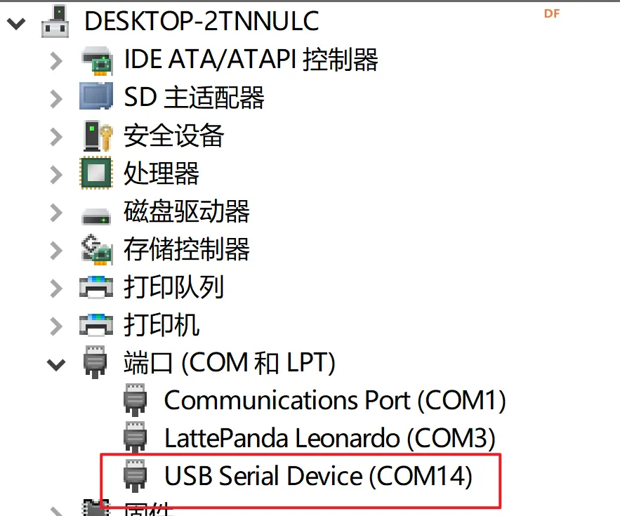 使用USB数据线将MicroPython版本的行空板K10插在电脑上,打开设备管理器查找行空板K10的对应端口,例如下图,端口为com14。