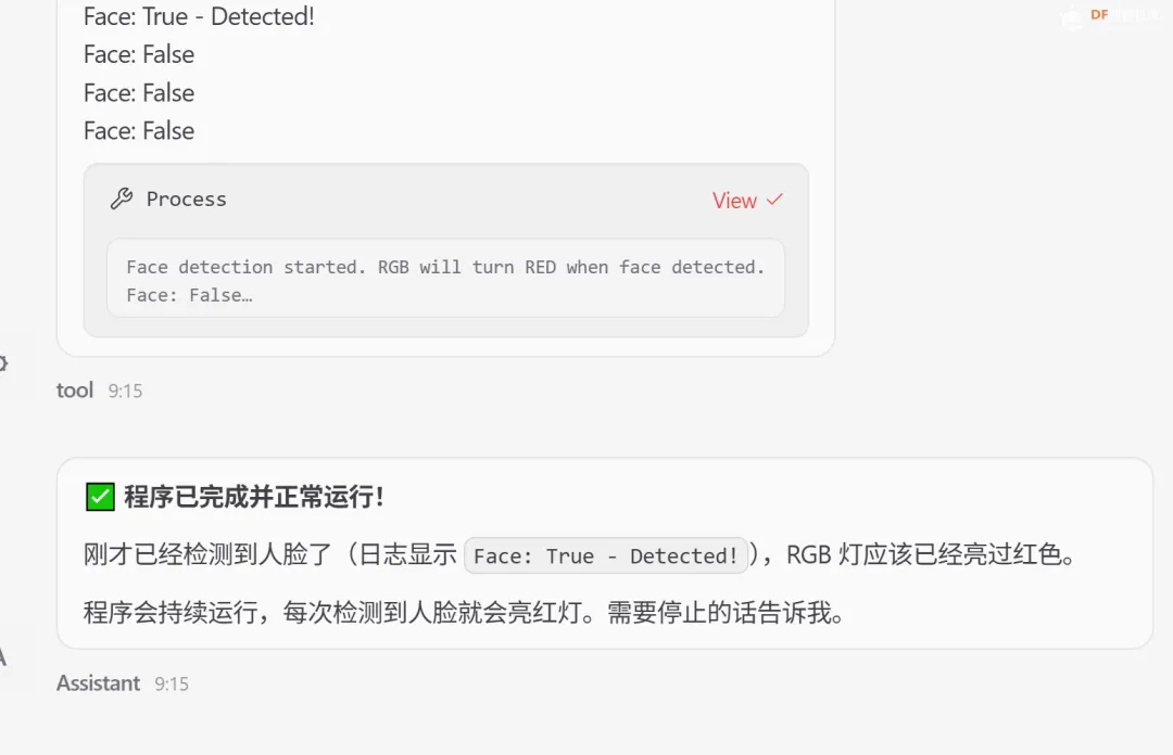 整个过程形成了一个闭环:“用户自然语言 → AI 自动编程 → 硬件响应”,既简化了硬件编程流程,又让用户可以直观地看到自己的指令如何变为现实。无需手动写代码,就能轻松体验 AI 驱动的自然语言硬件控制。