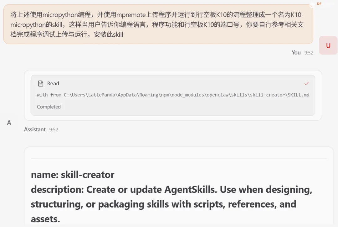 同样的我们可以将使用MicroPython编写程序通过mpremote上传程序并运行到行空板K10的过程写成一个Skill。这样在让OpenClaw通过自然语言编程控制行空板K10时就不用每次告诉它参考文档和使用的工具了。