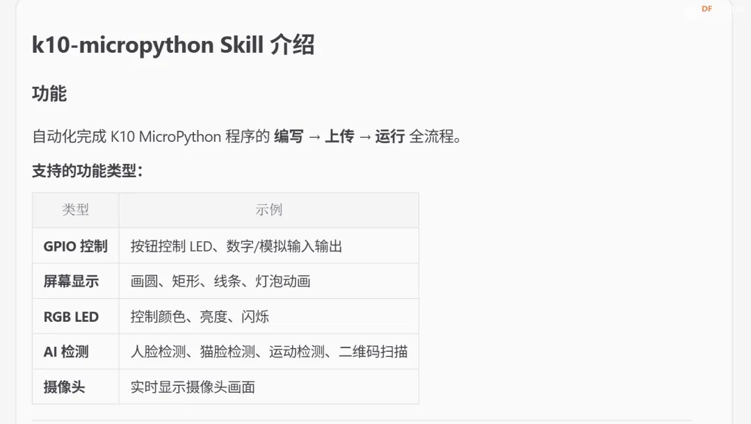 MicroPython 部分提供了 micropython-example.md 参考文档,其中包含行空板K10的MicroPython 示例代码,供 AI Agent 在生成程序时调用。