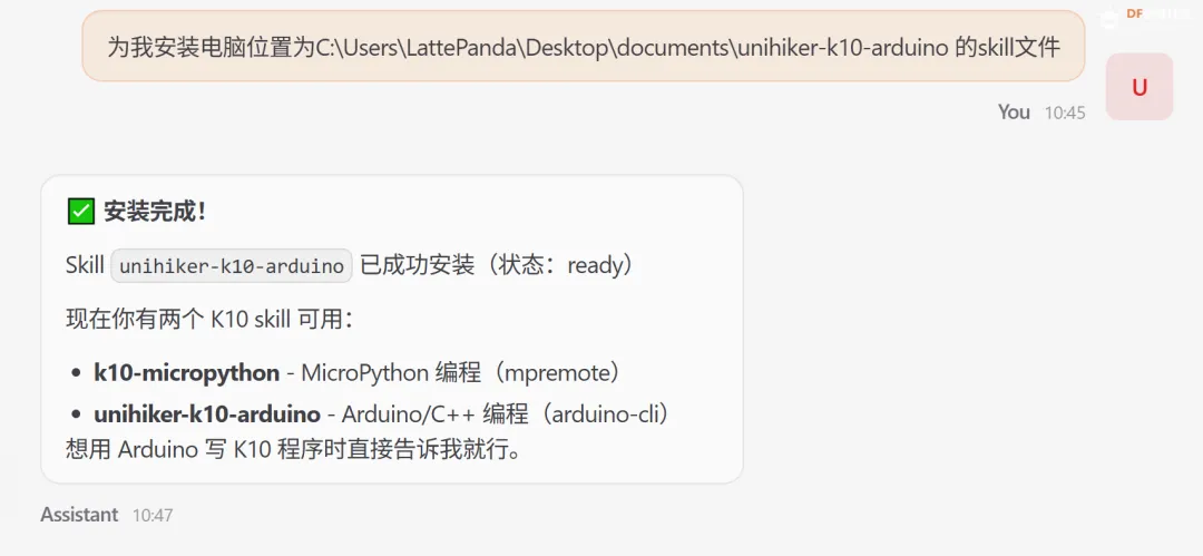 `为我安装在我电脑指定路径下的 unihiker-k10-arduino skill(需告知 OpenClaw 该文件夹的具体路径)`