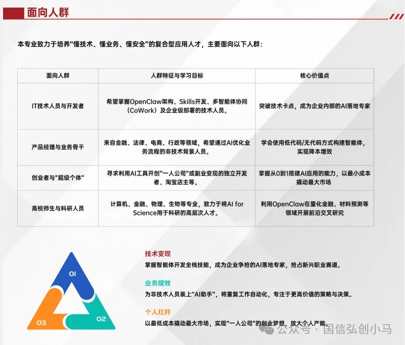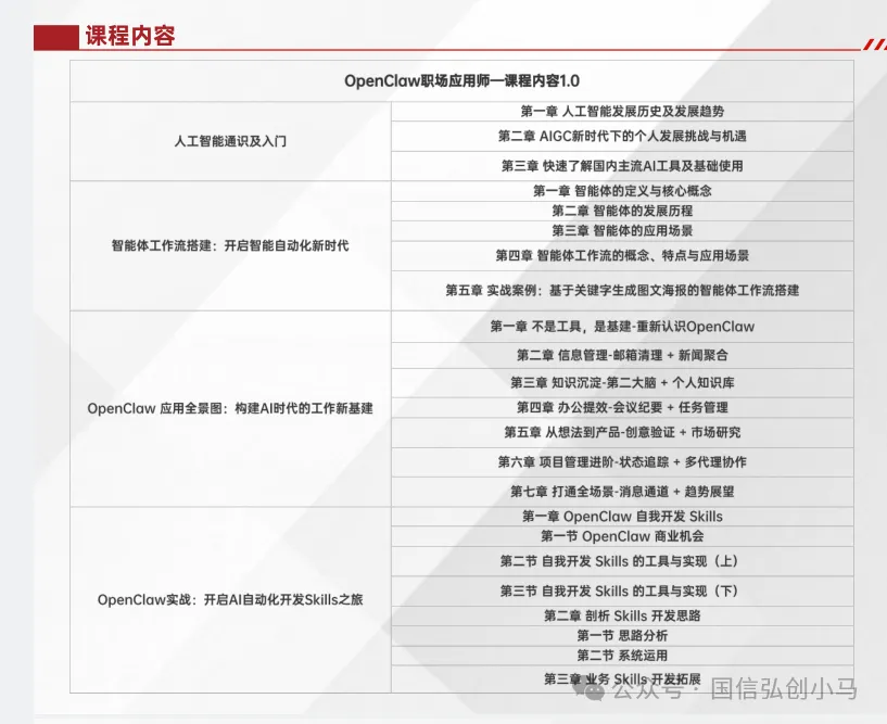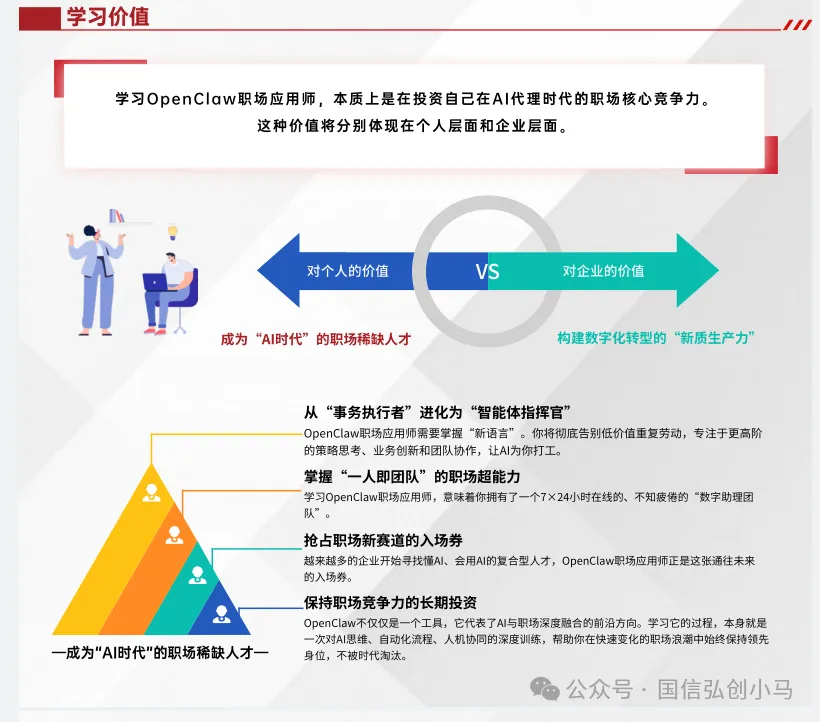 OpenClaw(俗称"龙虾系统")是一个开源的、可本地化部署的Al智能体(AlAgent)执行平台。关注国信弘创小马微信公众号获取更多报考详情与传统的对话式AI(如ChatGPT)不同,OpenClaw的核心价值在于"让AI从'只会说'进化到"能够干"。它能够自主完成文件操作、浏览器自动化、数据抓取、表格制作、代码编写与调试等复杂任务,相当于为企业或个人配备了一位7×24小时在线的“数字员工"