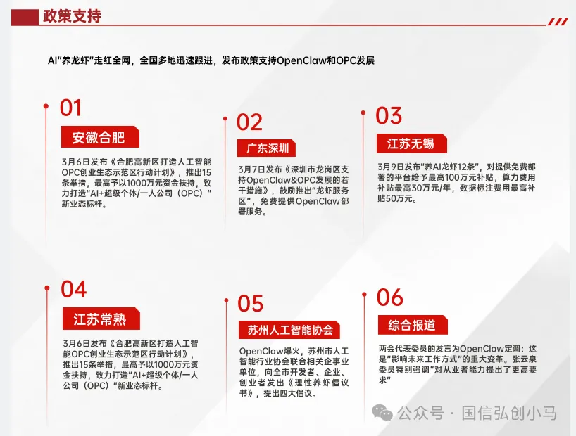 硬件端"肉身"觉醒:OpenClaw的爆火直接带动了Macmini等本地设备的销量暴涨,甚至出现断货。关注国信弘创小马微信公众号获取更多报考详情极客们开始魔改手机(ClawPhone),智能眼镜、智能家居厂商争相宣布适配。政策与安全同步跟进:工信部已针对AlAgent发布安全预警,安恒信息等安全厂商迅速推出保护系统(如ClawdSecbot)。同时,地方政府(如深圳龙岗、连云港海州)开始出台扶持政策,提供算力支持,鼓励基于OpenClaw的创业创新