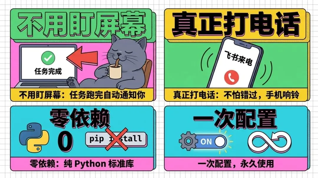 “代码写完后飞书提醒我” → 写完自动推送“跑完测试后打电话叫我” → 测试完手机响铃“部署完成后通知我一下” → 部署完第一时间知道