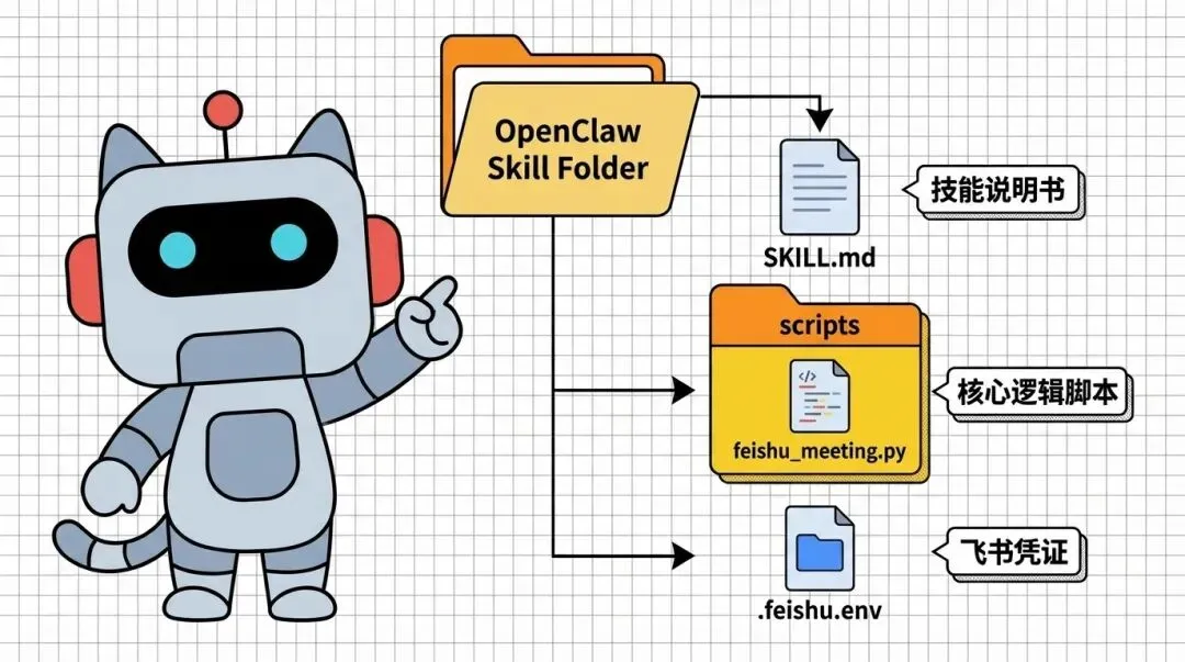 SKILL.md—— AI的“说明书”feishu_meeting.py—— 干活的脚本.feishu.env—— 存你的飞书凭证