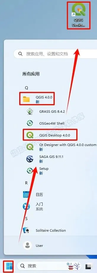 9.点击“开始“菜单栏,点击“所有应用“,找到“QGIS“软件,鼠标左键拖拽到桌面上即可创建桌面快捷方式