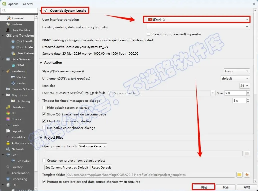 12.勾选“Override System Locale”,将语言改为简体中文,然后点击“确定”