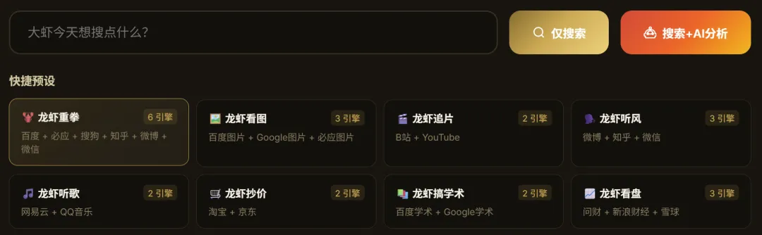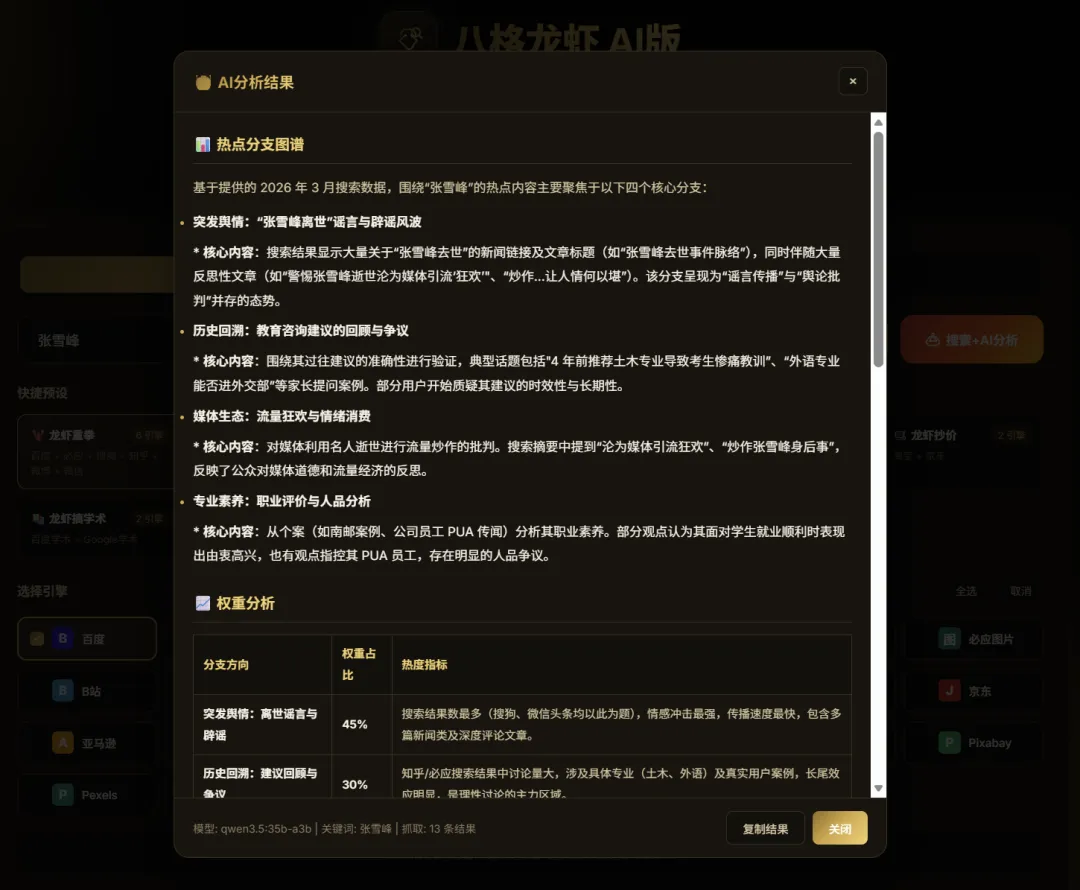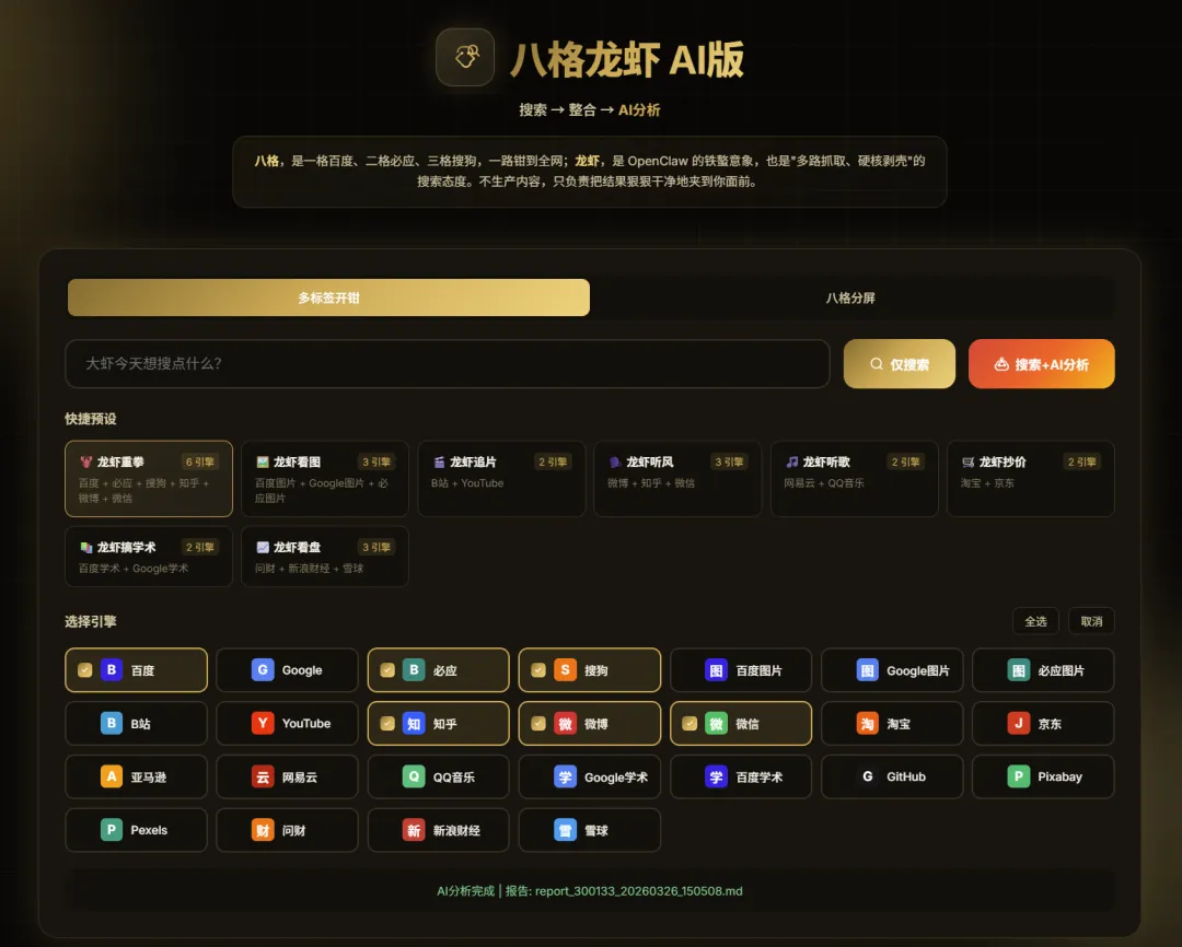 大家都在玩Openclaw龙虾,这不我的 八格龙虾 来了Openclaw越来越火,为了蹭热度,我也做了一个 八格龙虾 玩一玩...这几年,很多人都有一种错觉:工具越来越多,效率应该越来越高。可现实恰恰相反。我们每天面对的,不是信息不够,而是信息太多;不是没有答案,而是答案到处都是;不是不会搜索,而是搜完以后,脑子更乱了。一个热点,要去百度看一遍,Google看一遍,知乎翻观点,微博看情绪,微信找深度,B站看视频。页面越开越多,标签页越堆越满,最后再回到聊天窗口里,问一句:你帮我总结一下。看起来很先进。做起来却很原始。真正麻烦的,不是累。而是你看完一圈之后,心里还是没底:这个结论,到底是查出来的,还是“想出来的”?这个数据,到底有来源,还是只是说得像真的?也正因为这个原因,我最近做了一个小工具,名字有点怪,叫:八格龙虾。这个名字,听上去像是半夜想出来的。但它其实很形象。“八格”,是多格并行,多路展开。“龙虾”,是看到信息就夹,夹回来再剥壳。它不负责生产内容。它做的事情很简单:先把全网结果狠狠干净地夹到你面前。很多朋友问我:既然现在大模型已经这么强了,为什么不直接用对话窗口?答案其实很简单。因为很多时候,我们缺的不是一个“会说话”的模型,而是一条可核对、可指定、可组合的信息路径。直接在对话窗口里提问,当然方便。但一旦碰到热点研究、舆情判断、选题分析、商品比价、股票观点整合这种任务,仅仅“会回答”是不够的。你真正需要的,是两样东西:第一,答案最好能对得上来源。第二,不同需求,要去不同的网站查。热点和学术,不是一套入口。比价和看盘,也不是一条路径。真正专业的信息获取,从来不是“一个窗口走天下”,而是根据任务设计搜索组合。 八格龙虾的本质01八格龙虾,就是冲着这个问题去的。它表面上看,是一个搜索工具。但本质上,它更像一个信息工作台。你输入一个关键词,它不是只给你开一个网页,而是可以按照你设定好的组合,同时去多个平台搜索。百度、Google、必应、搜狗、知乎、微博、微信、B站、YouTube、淘宝、京东、Google学术、百度学术、GitHub……该去哪里,不再靠临时想;该怎么组合,不再靠人肉切换。更关键的是,它不止停留在“帮你打开网页”。八格龙虾有两种模式。仅搜索模式适合你先把信息面铺开,自己快速浏览。搜索+AI分析模式搜索之后,再把搜回来的材料整合起来,交给大模型继续分析,最后形成报告。这两者的差别,看似不大,实际上差得很远。前者,是“你自己到处找”;后者,是“先把材料找齐,再让模型带着材料说话”。这就像一个记者采访和一个人闭门写稿的区别。都能写文章,但底气完全不同。AI分析这块是双模型配置,支持本地ollama大模型和外接deepseek大模型,用户自由选择,本地大模型可以高度保护隐私,而外接大模型让你可以随时联接最强大脑。为了让这个工具不是“看起来很强,实际上很麻烦”,我又给它做了8个快捷预设。搜热点的,找图片的,追视频的,听舆情的,搜音乐的,比价格的,搞学术的,看股票的。每个预设后面,都不是随便起个名字,而是一套已经配置好的搜索路径和分析逻辑。(喜欢股票的,对 龙虾看盘,一定有兴趣)你点一下,不只是换了个按钮,而是直接切换了一种“信息采集阵型”。这一点,我自己用起来很有感触。因为真正耗人的,从来不是“搜索”本身,而是每次都要重新思考:我该去哪里看?先看哪个?后看哪个?哪些值得看?哪些只是噪音?八格龙虾想做的,就是把这些重复性的体力活狠狠干掉。 工具最大的特点02但这个工具我最喜欢的地方,还不是多平台搜索,也不是AI分析。而是:提示词外置,用户可以自己修改。这件事特别重要。因为很多工具一旦做好,逻辑就写死了。你只能用,不能改。今天适合你,明天未必适合你;适合这个行业,未必适合另一个行业。但八格龙虾不是。它背后的提示词是外置的,用户可以自己调整。你觉得热点分析不够深,可以改;你觉得舆情维度不够细,可以加;你想把它调成更符合自己行业习惯、研究习惯、写作风格的版本,也完全可以。这意味着,它不是一个封死的黑盒。它更像一个可以被你持续调教、持续升级、持续打磨的开放式框架。今天它帮你搜。明天它按你的思路去分析。再往后,它会越来越像你自己的工作流。 做这个工具的思考03这也是我越来越强烈的一个感受:未来真正稀缺的,可能已经不是信息。也不是模型。而是把真实来源、任务路径、分析逻辑和最终判断,连成一条完整链路的能力。换句话说:真正值钱的,不是谁更会提问;而是谁能更快找到来源,更快核对信息,更快形成判断。八格龙虾,就是我在这个方向上的一次小尝试。它不是什么惊天动地的大产品。但它至少解决了一个很现实的问题:别再让人一边搜网页,一边怀疑答案,一边自己给自己当搬运工。 获取方式04最后,再说一个大家更关心的。怎么免费拿到这款小工具?很简单。我的新书会在4月上线,到时候,八格龙虾会随书附赠。而且,它不是孤零零的一个小玩具。你可以结合书里的方法和提示词一起使用。也就是说,你拿到的,不只是一个工具,更是一套可以真正用起来、改起来、升级起来的思路。再配合书里的提示词一起使用,你会发现,这个小工具带来的,不只是惊喜,更是一种全新的体验。 结尾了05不是不用大模型。而是很多时候,不能只让它