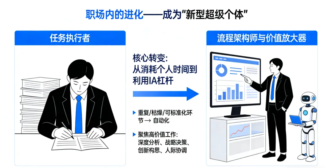 模式1:职场内的进化——成为“新型超级个体”。你的核心转变,是从消耗个人时间的“任务执行者”,进化为利用AI杠杆的“流程架构师与价值放大器”。你不再满足于亲手完成每一项被指派的工作,而是开始审视工作流:哪些环节重复、枯燥、可标准化?你的目标是将这些环节自动化,从而将自己解放出来,聚焦于只有人能完成的更高价值工作——深度分析、战略决策、创新构思与人际协调。最终,你通过让AI承担“执行层”的职责,让自己在组织内成为那个既懂业务、又善用先进生产力的、难以被替代的核心节点。