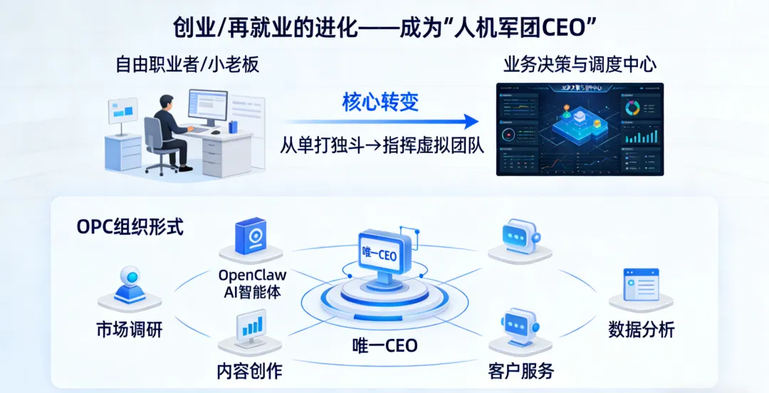 模式2:创业/再就业的进化——成为“人机军团CEO”。无论你是渴望创业的探索者,还是寻求转型的再就业者,这条路径的核心转变是:从单打独斗的“自由职业者”或“小老板”,进化为指挥虚拟团队的“业务决策与调度中心”。你以OPC为组织形式,将自己定位为公司的唯一CEO,而OpenClaw等AI智能体则成为你麾下不知疲倦的“虚拟员工”,负责市场调研、内容创作、客户服务、数据分析等模块化任务。你的目标是,以最低的初始成本,快速验证并跑通一个微型服务或产品,实现轻资产、快响应的创业变现。