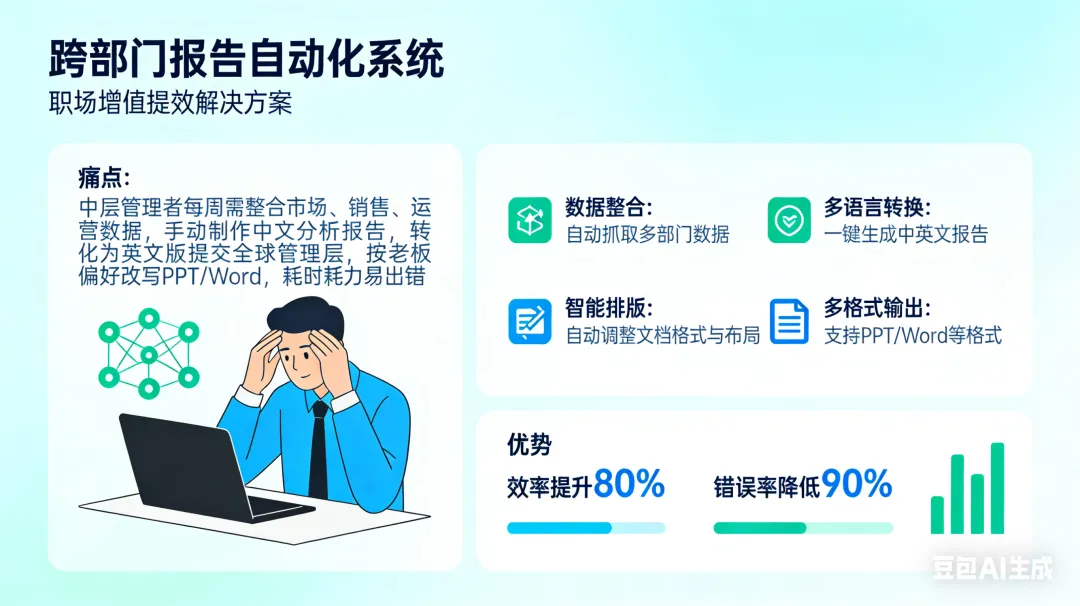1.痛点:作为中层管理者,你每周需要整合市场、销售、运营等多个部门的数据,手动制作中文分析报告。这还不够,这份报告时常需要被转化为英文版提交给全球管理层,或根据不同老板的偏好改写成PPT、Word等不同格式。整个过程耗时耗力,且容易在重复劳动中出错。