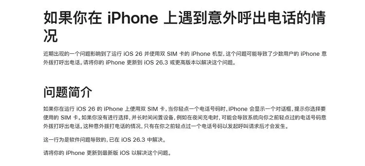 苹果表示,少数用户的iPhone会意外出现拨打呼出电话的情况,主要影响的是运行iOS 26系统且使用双SIM卡的iPhone机型。