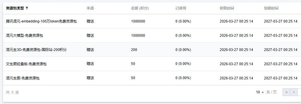 首次开通腾讯混元大模型服务后,混元生文会发放 100 万 token 免费调用额度,生图给 50 次,生 3D 给 10 次。有效期是 1 年。
